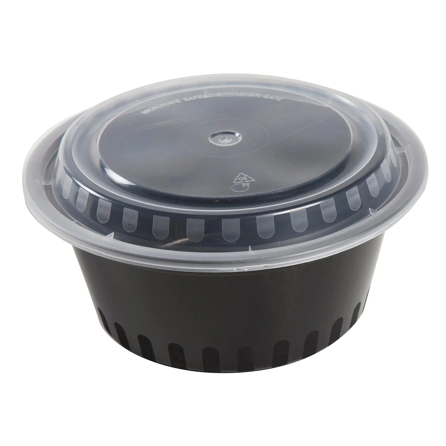 37oz Black Round Container with Lid, 150 Count: A pack of 150 round black plastic containers, each with a capacity of 37 ounces, including lids, suitable for food storage and takeout.